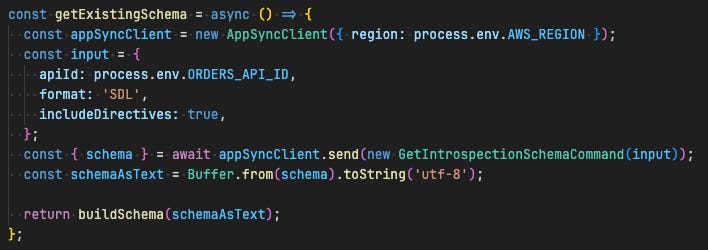 All we need is the ApiId and to be running in a context with sufficient permissions to introspect our AppSync API. Once we have our existing schema text, a quick buildSchema() gives us our final input for GraphQL Inspector's diff().