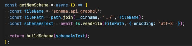 Let's tackle the easy one first. Your new schema is sitting in front of you on disk. In my case, my soon-to-be-deployed Orders schema is at orders/schema.api.graphql. After a simple fs.readFile(), I only need to invoke buildSchema() to have my new schema diff input.