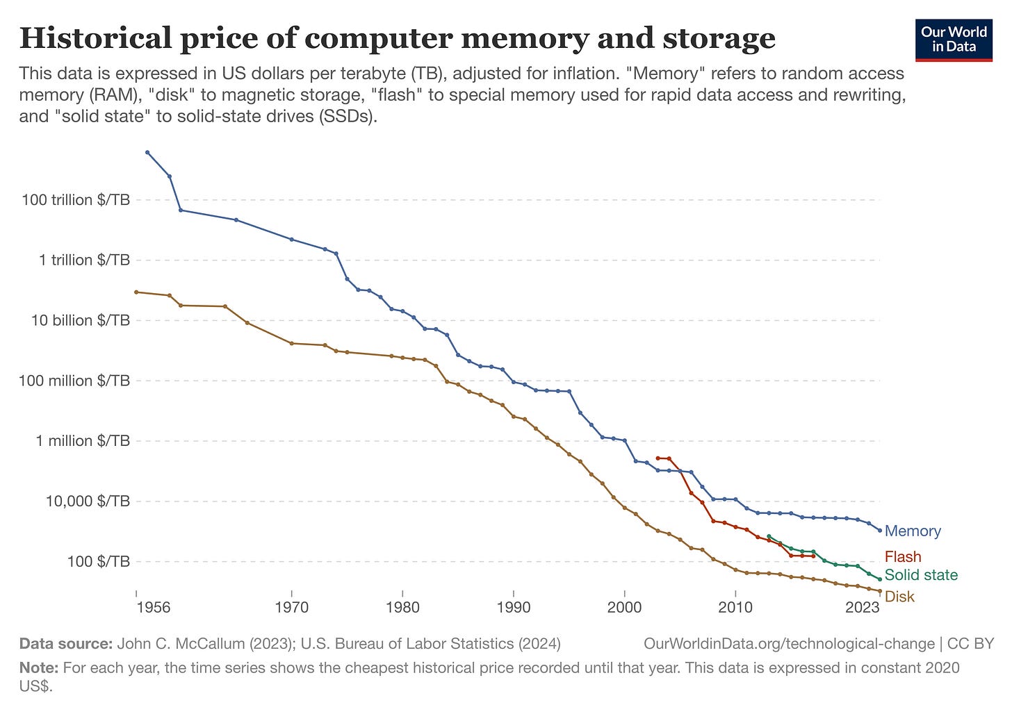 Today, our disk cost per MB is less than $0.000011 (see figure below).2 Storage has become one of the most cost-efficient resources in our systems, while compute has become the bottleneck.
